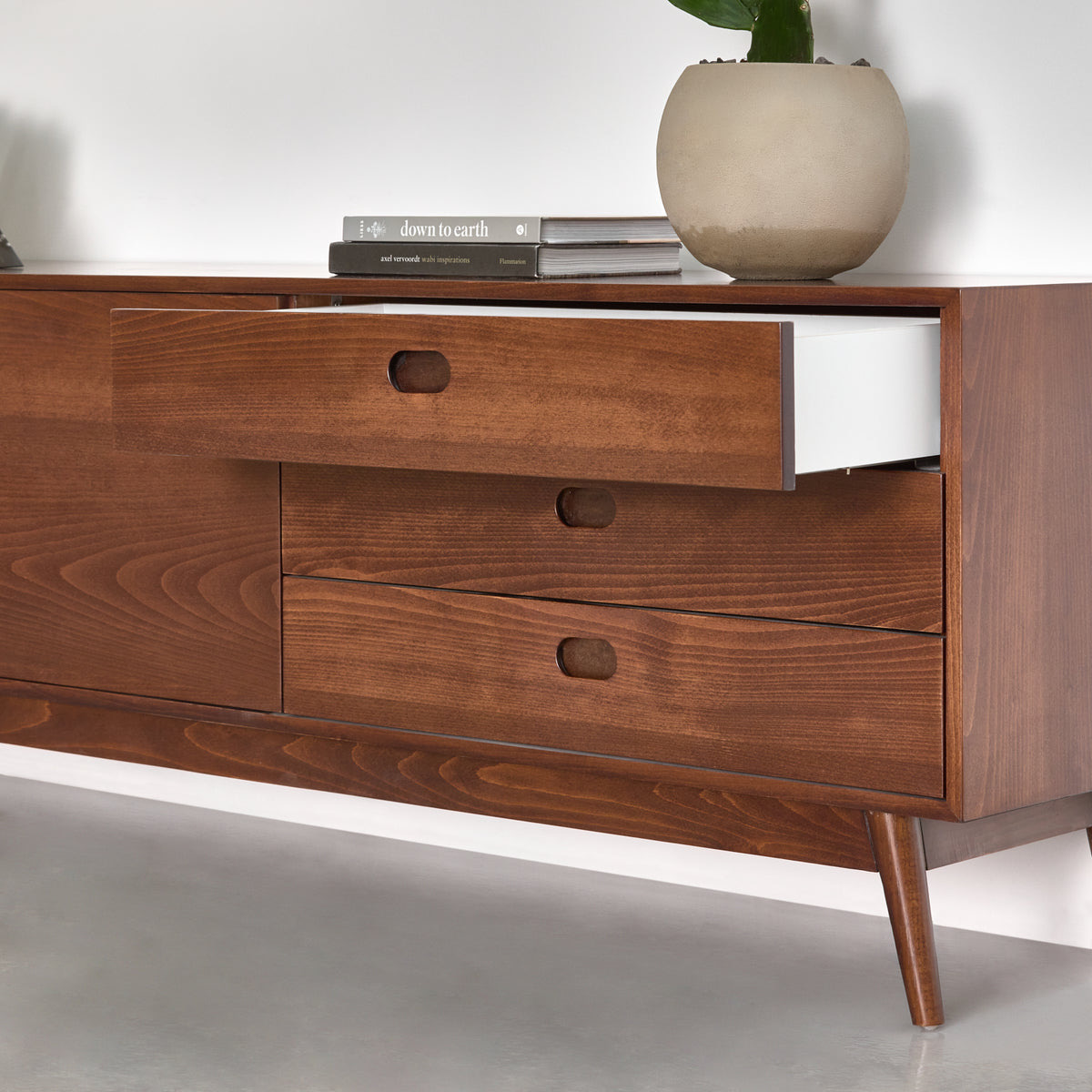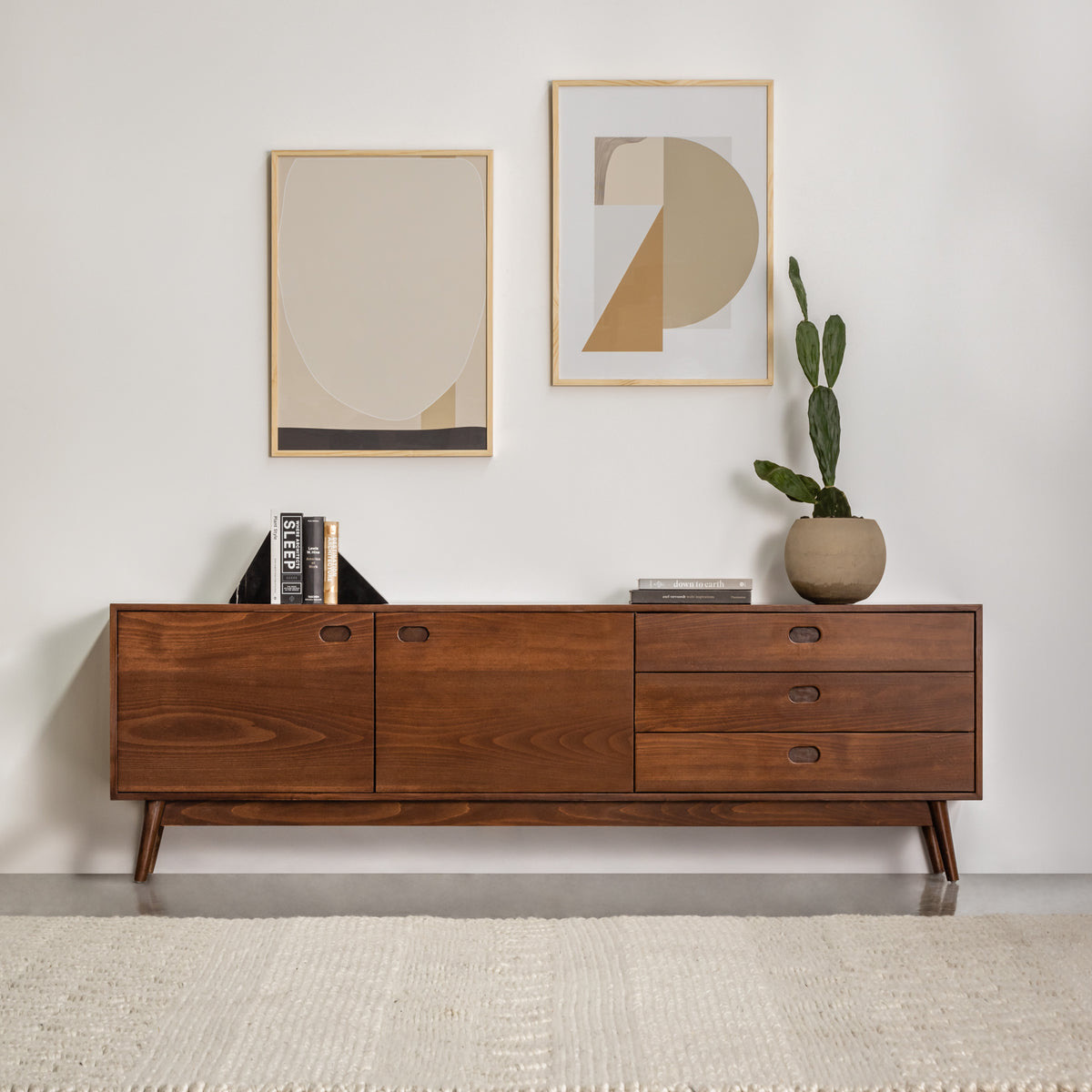 When it comes to practicality, the unit offers a smart balance of storage options. On the right-hand side, three glide-open drawers provide space for remote controls, cables, or other essentials. On the other hand, the left side features two wide cabinet doors that open to reveal generous shelving for books, décor, or media equipment. Furthermore, the minimalist cut-out handles preserve a sleek look, while the tapered legs reinforce its classic mid-century silhouette.
